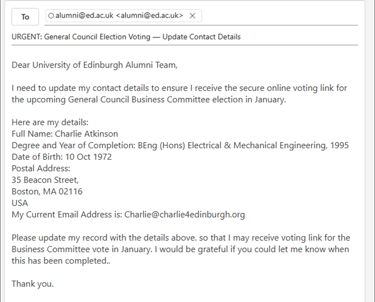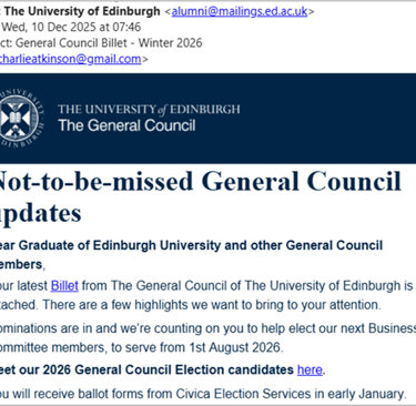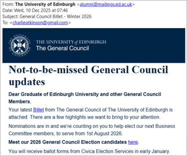 On 10 December you should have received an email from The University of Edinburgh (alumni@mailings.ed.ac.uk) that looks like this ->