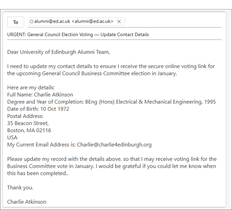 When you graduated from Edinburgh, you automatically became a member of the General Council and eligible to vote. Voting will take place online in January 2026. To receive your personal voting link, the University needs your current email address on file.